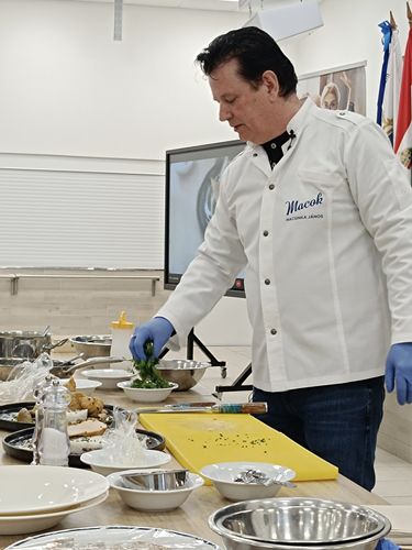 📺 Mi történt? A modern technika segítségével – 3 óriás kivetítőn keresztül – mindenki testközelből figyelhette a séf „műhelytitkait”. A csipeszhasználattól a textúrák játékán át a mártások tökéletes elhelyezéséig minden apró mozdulat látható volt. A menüben vizsgafeladatok modernizált változatai szerepeltek (hal tempura és tejszínes-gombás csirkemell), bebizonyítva, hogy a vizsgán is lehet éttermi színvonalat alkotni!